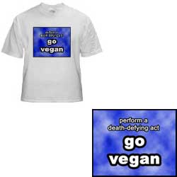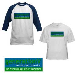 merchandise generationV and Bay Area Vegetarians offer a range of different t-shirts, caps, mugs and other cool apparel thru the cafepress.com website. Cafepress offer a wide range of item that may not show in our store, but we can always add them for you with any design. Plus, if there's something you'd like tweaked on the design, like only have a design on the back of a shirt, then we can do this, too. We receive a couple of dollars from the purchase of each item (the majority of the proceeds go to cafepress). All proceeds from these sales go directly towards our vegetarian outreach programs. Enjoy! And thanks for your support.
